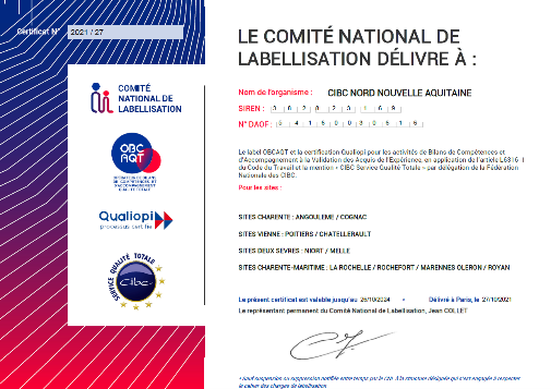 Pour les bilans de compétences et accompagnement VAE, le CIBC Nord Nouvelle Aquitaine détient le Label OBCAQT et la mention service qualité totale.