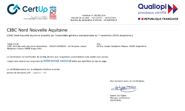 Pour les actions de formation, Le CIBC Nord Nouvelle Aquitaine a obtenu la certification Qualiopi formation décernée par l’organisme de certification Cert‘Up Maieutika.